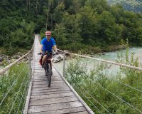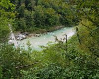 Tuż za Bovcem było rozgałęzienie, na drogę asfaltową i taką, którą jeszcze nie jechałem. Sprawdziłem na nawigacji, że na pewno dojedziemy nią do Kobaridu lub jakiegoś mostu umożliwiającego nam powrót na asfalt. Początkowo szutrowo-żwirowa droga była bardzo przyjemna, prowadziła tuż przy brzegu rzeki Soca. Dojechaliśmy do jednego z wielu mostów wiszących, gdzie zrobiliśmy sobie sesję. Stwierdziliśmy też, że jest tak przyjemnie, że będziemy kontynuować jazdę tą stroną.